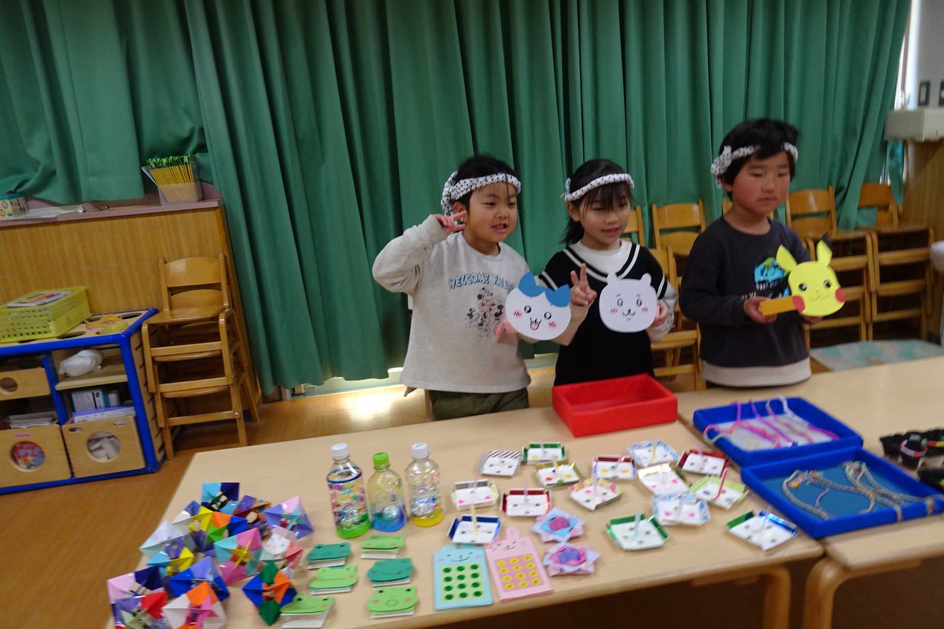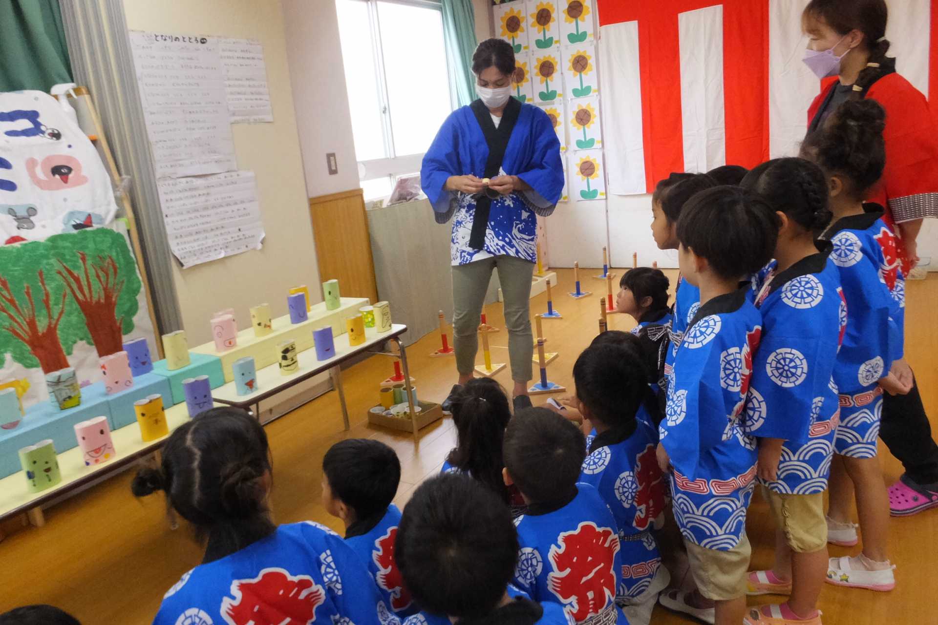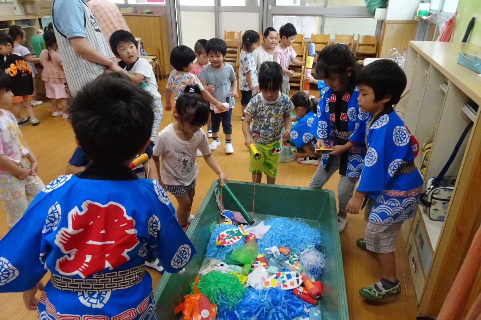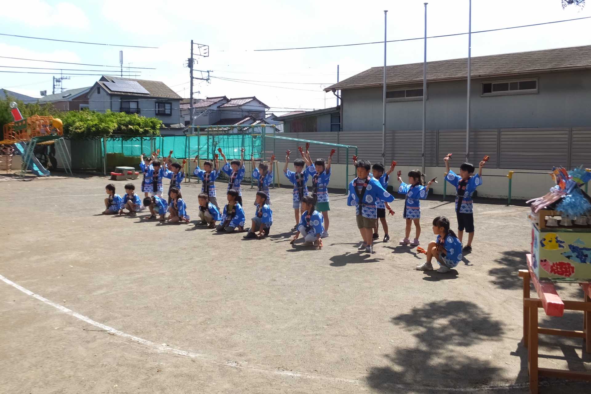 ひまわり組が中心となり、ばら組・ゆり組の子どもたちと夏まつりを楽しみました。