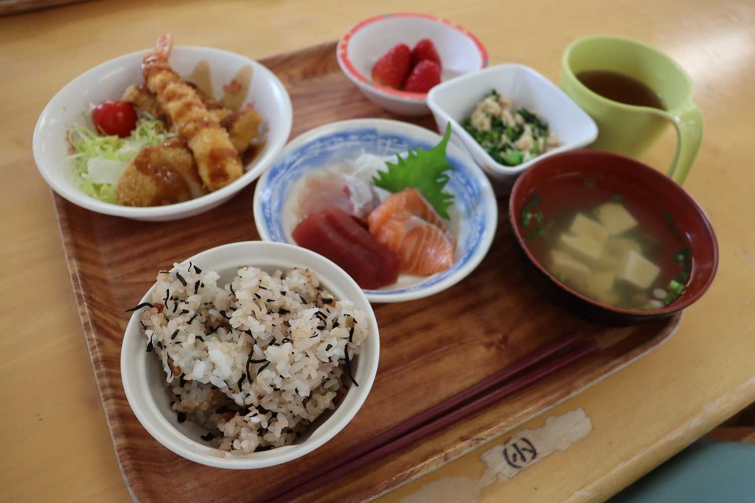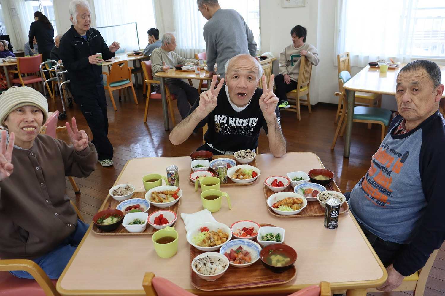 令和8年3月24日(火) あさひホームで令和7年度の年度末親睦会をおこないました。昼食は、お刺身やミックスフライなど、豪華な内容となっており、満腹になるまで楽しみました。昼食後は、1年間を振り返ってのスライドショーの視聴、各活動班からの活動報告がありました。最後に園長から、職員の退職・異動の発表があり、今年も笑いあり、涙ありの親睦会となりました。