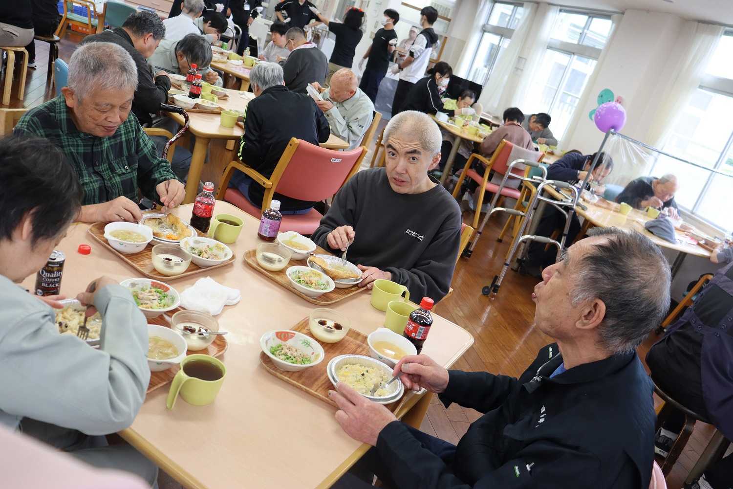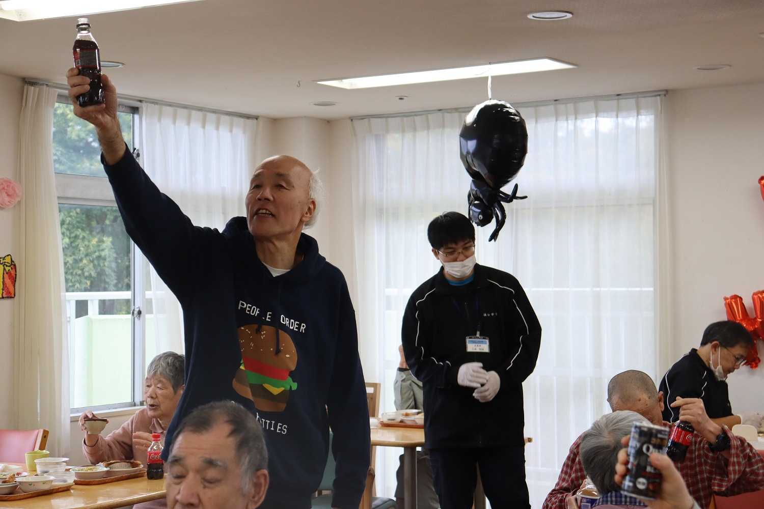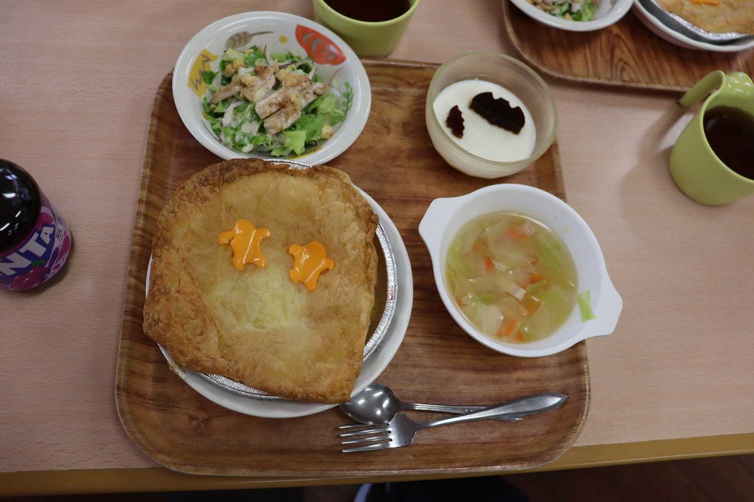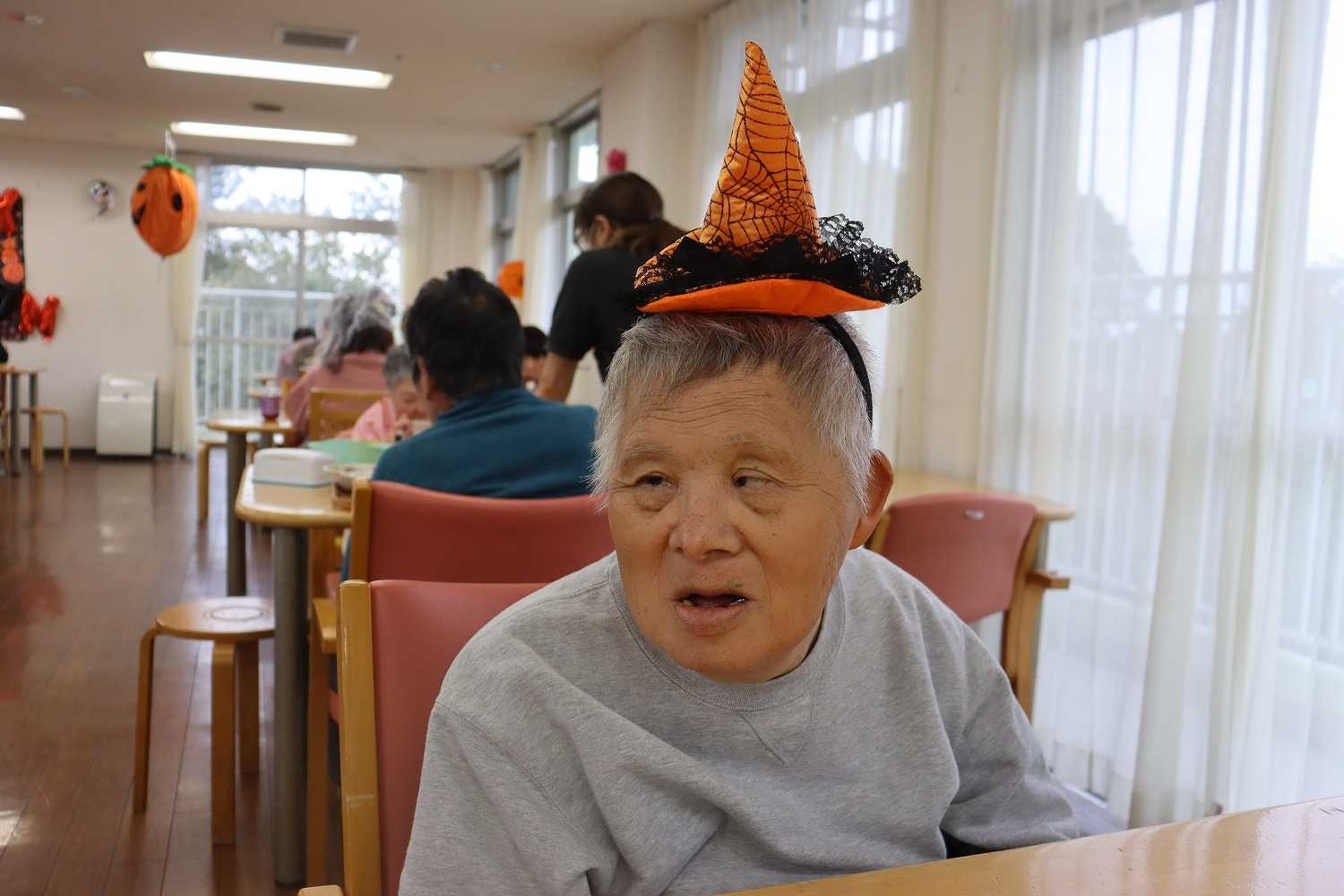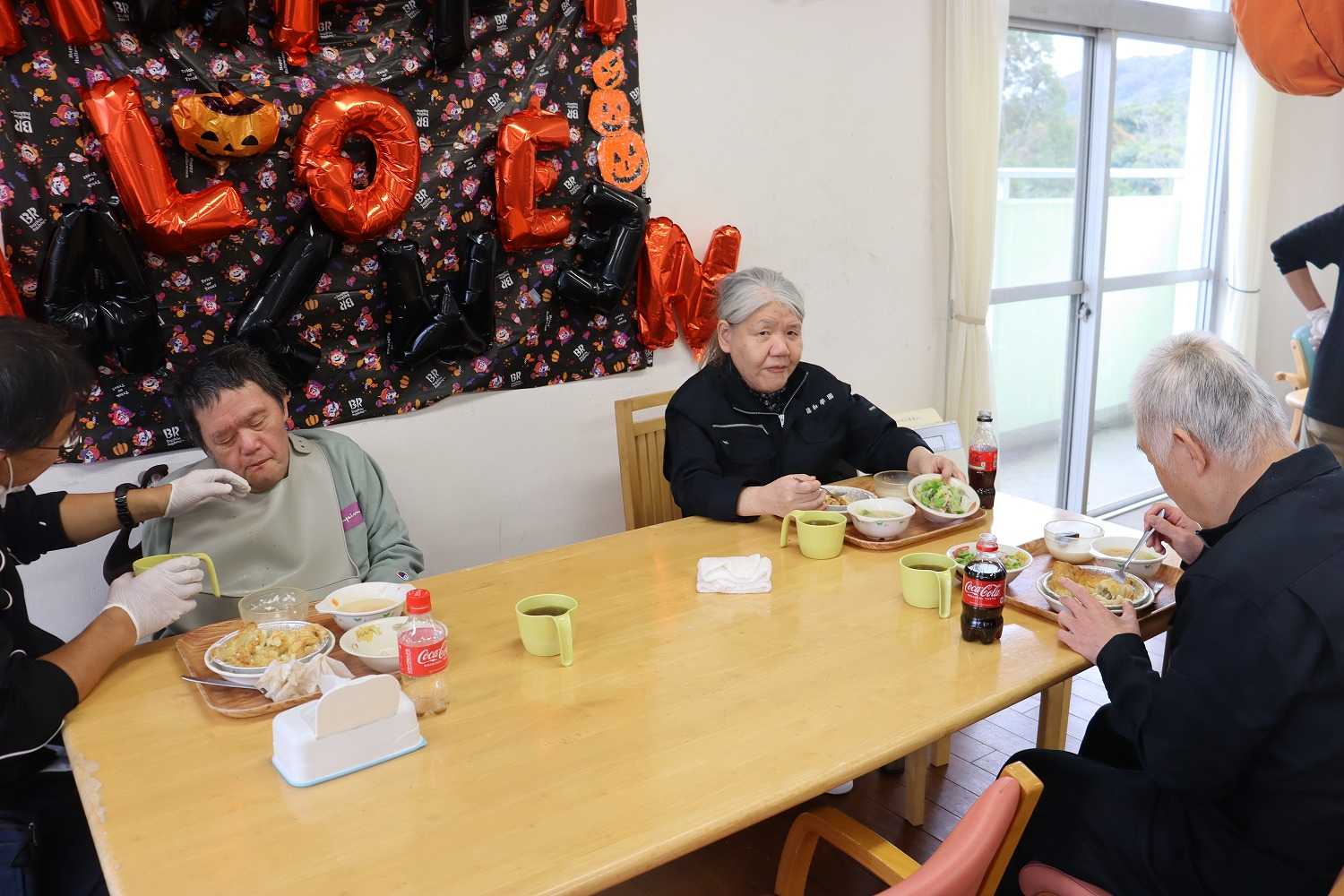 令和7年10月31日(金) お昼の時間を利用して、ハロウィンパーティーをしました。職員による仮装やハロウィンの飾りつけを見ながら、昼食を食べました。昼食はグラタンをメインとした温まるメニューとなっており、満腹になるまで楽しみました。短い時間ではありましたが、楽しいひと時を過ごしました。