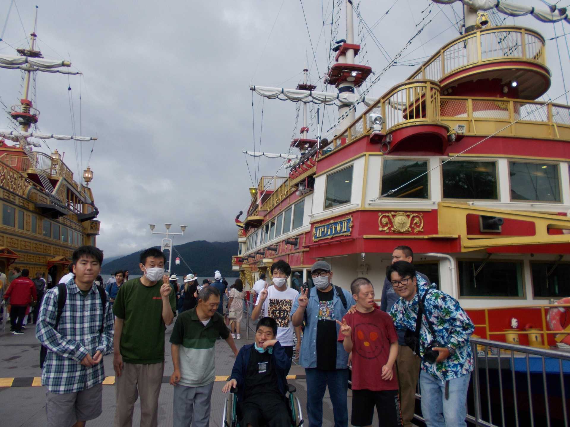 今年度の旅行として毎週10名程度のグループに分かれて箱根芦ノ湖方面に一日外出に行きました。芦ノ湖でおいしい食事を食べたり、海賊船(遊覧船)に乗って箱根の雄大な自然を満喫しました。雨天の日には箱根園水族館見学をおこないました。秋の行楽シーズンでとても楽しい旅行となりました。