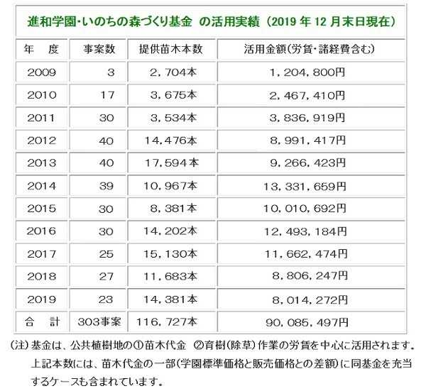 私達の活動は、「いのちの森づくり友の会」への多くの皆様からのご寄附・助成・協賛により支えられています。公共の植樹活動に提供する苗木の代金及び植樹・育樹作業に従事する障害者の工賃に還元させて頂いています。「友の会」は、お陰様で12年目を迎え、これまでに活用させて頂いた基金は累計9,000万円を超えています。「友の会」にご加入、並びにご寄附・助成・協賛を頂いている皆様に厚く御礼申し上げます。