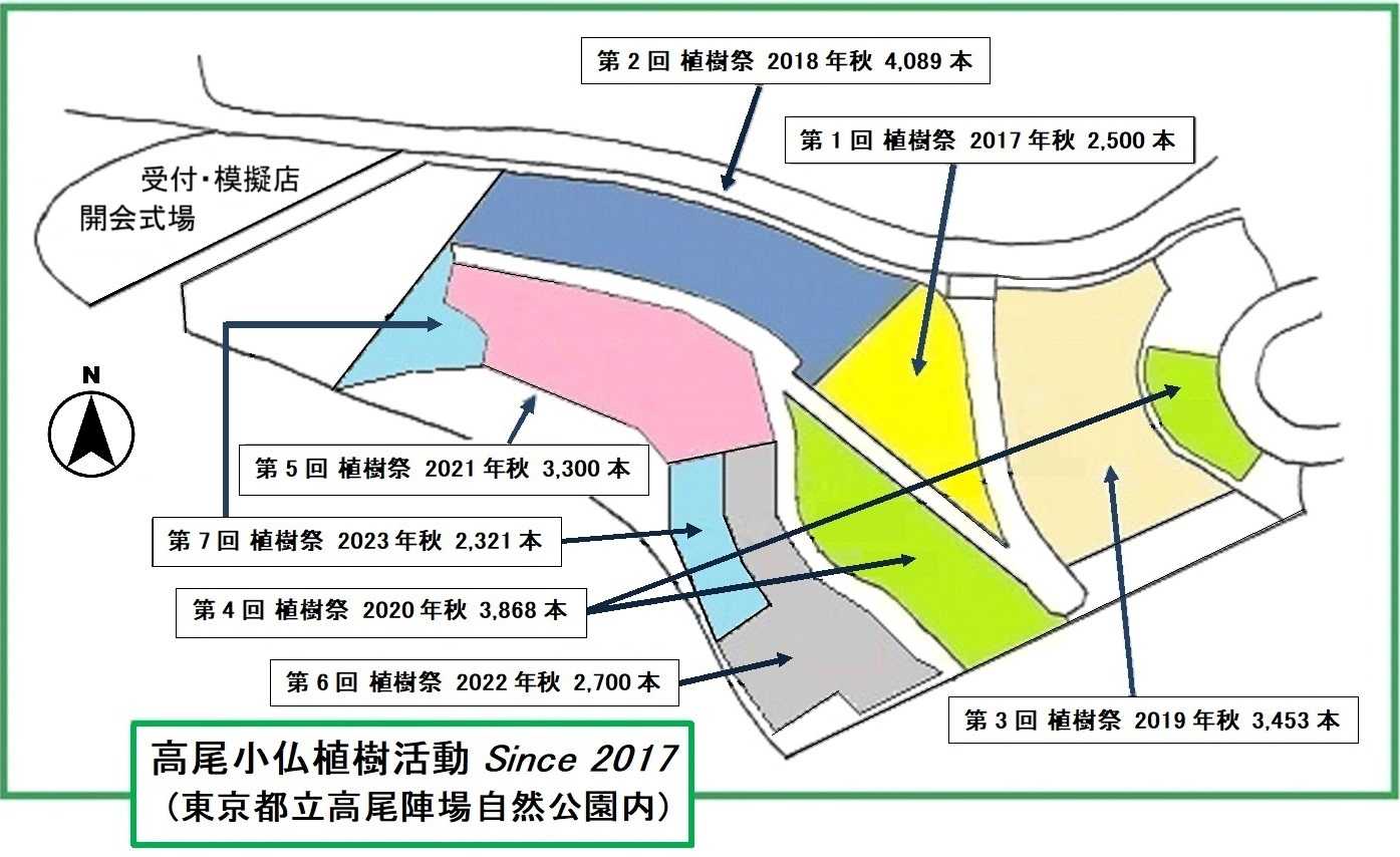 高尾小仏植樹活動は、中央高速道路の小仏トンネルの工事残土による巨大な盛土場に、自然環境保全及び防災の観点も踏まえて「森」を再生する取り組みで、2017年に始まりました。宮脇昭先生(横浜国大名誉教授)が提唱された潜在自然植生に基づく混植・密植方式を採用、毎年、植樹祭を開催し2023年秋の第7回の植樹祭で盛土場の頂上部に達しました。