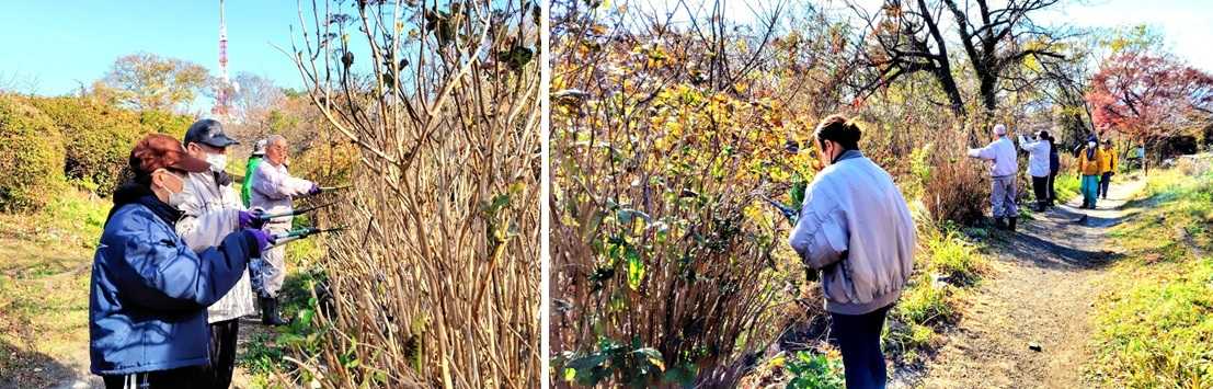 北風が強く吹く寒い日でしたが、晴天に恵まれ、植樹や剪定作業を行うと体は温まり、冷気が心地良く感じられます。午前中に1時間半、昼食を、進和学園が運営するホットケーキパーラー「湘南リトルツリー」で取った後、午後から約1時間、お互いに交流を深めながらの日中作業となりました。皆さんの頑張りで、アジサイ園のかなり奥の方まで剪定も進み、見通しも開けて来ました。
