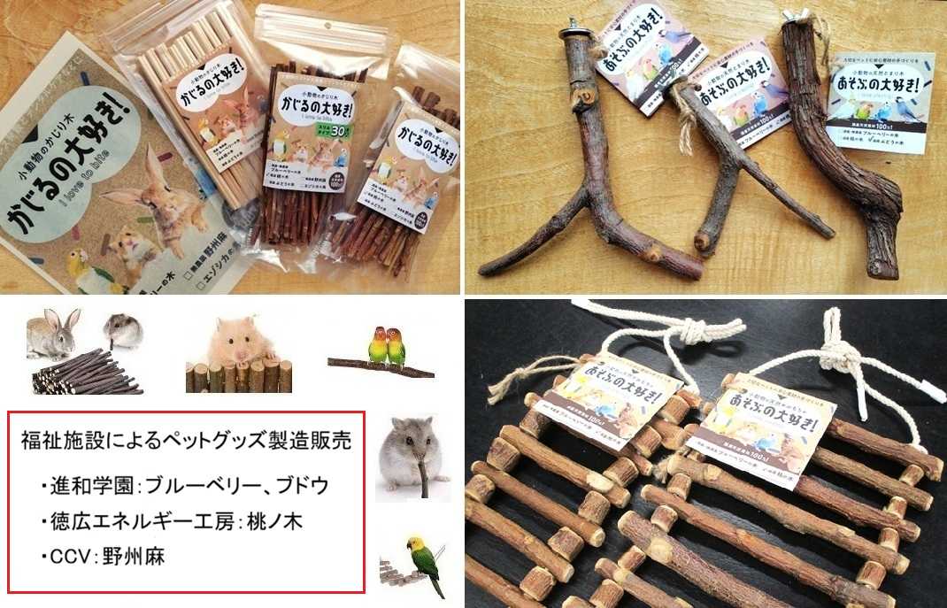 進和学園では、「しんわルネッサンス」に隣接する「ブルーベリーガーデンしんわ」において、約280本のブルーベリーを自家栽培しており、夏季はブルーベリーの摘み取りで賑わいますが、その保全のために生じる剪定枝を有効に活用しています。また、山梨県の農家からお譲り頂いているブドウの木も商品化、長野の徳広さんは、地元の桃ノ木を、栃木のCCVさんは珍しい野州麻の茎を活用してペットグッズを製造しています。