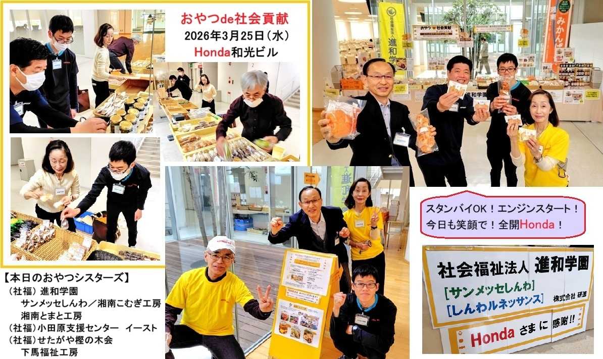 本年度は、Honda様の青山本社ビルが移転のため、和光ビルにおいて毎月、販売会を開催させて頂きました。お陰様で、青山本社及びMiles Honda Cafe(ウエルカムプラザ青山)における売上減少を補い、進和学園をはじめ連携福祉施設「おやつシスターズ」の皆さんの工賃還元にも貢献することが出来ました。重ねて御礼申し上げます。
