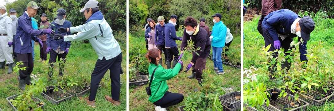 4月24日(金)午前中の「どんぐりブラザーズ」の育樹活動の中で、翌日のPresent Tree植樹イベント用のポット苗24種類200本を準備し、植樹地付近の指定場所に納品しました。