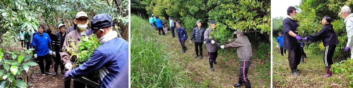 「宮脇方式(混植・密植)」に基づく植樹のため、ポット苗を樹種に応じ仕分けし、各トレーにおいてバランス良く樹種が混ざるようにミックス作業を行った上で、参加者16名(注)でバケツリレーにより指定場所へ運びました。10トレーの苗木を、5回程のバケツリレーで尺取り虫のように前進します。この日は、風が強く気温も低目で冷えましたが、皆で体を動かしている内にポカポカと温まりました。