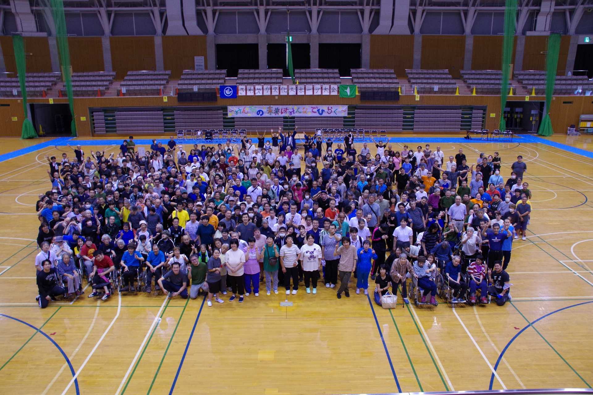 午前の部は全施設から多くの利用者ご本人が一同に集まり開会式、ラジオ体操を行いました。開会式の後全体競技として2組に分かれて大玉転がしを行いました。皆で協力しながら大玉を転がす姿に、会場全体が一体となって盛り上がりました。その後はくじ引き競争を楽しみ、サンメッセで作ったクッキーと交換し、笑顔が溢れていました。午後の部は卓球、バドミントン、ソフトボウリング、ユニカール、ボッチャ、キンボール・パラバルーンとそれぞれに多彩な競技を体験し、さわやかな汗を流しました。