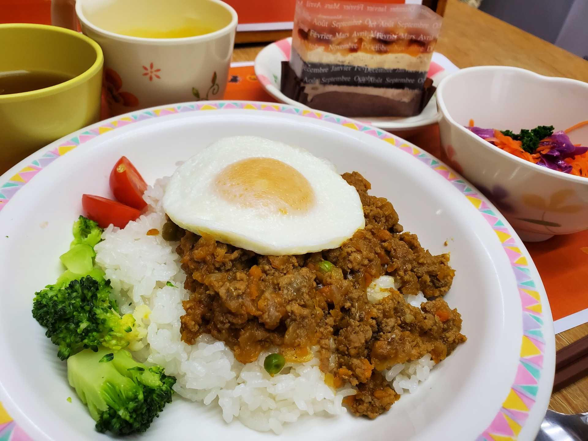 本人自治会より給食班のおまかせで、ハロウィンランチを依頼しました。今回はドライカレーでしたが、かぼちゃのクリームシチューやケーキでハロウィンの雰囲気が出ていました。ハロウィンランチは好評で皆さん喜ばれていました。