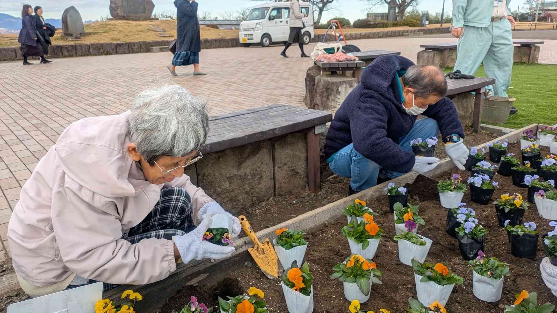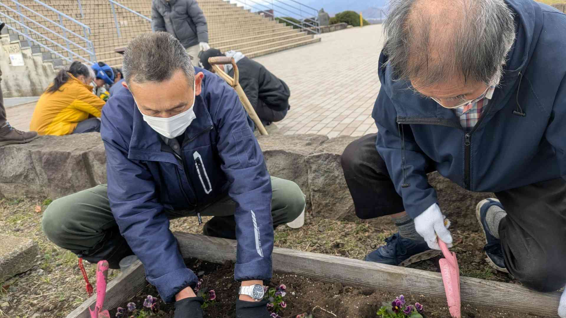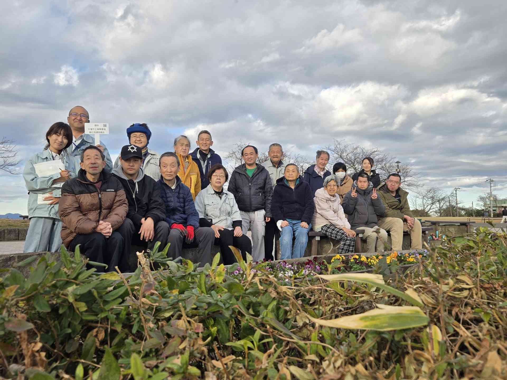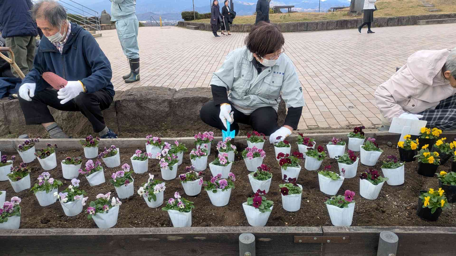 令和7年12月18日(木)に平塚市みどり公園・水辺課 公園整備担当より湘南平花壇の植栽について依頼がありました。当日は、みどり公園・水辺課3名、サンメッセしんわよりご本人12名、職員3名、しんわやえくぼよりご本人4名、職員1名で150株のビオラを植えました。天候にも恵まれ、みんな生き生きと作業に没頭してました。