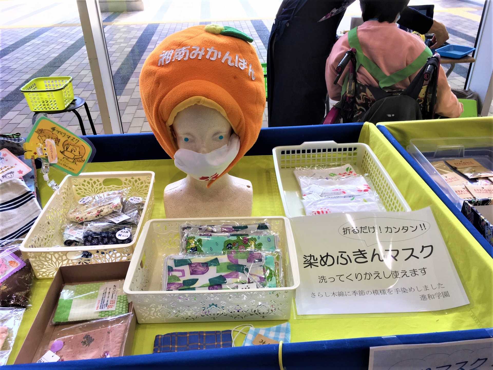 このたびの新型コロナウイルス感染の影響で、予防のためのマスクが不足しております。平塚市内の福祉事業所を中心に組織する「ひらつか障がい者福祉ショップありがとう」は、平塚市役所内に設置する常設ワゴンショップですが、その福祉ショップに加盟する福祉事業所6か所が、それぞれ手作りマスクの製作を始めました。平塚市障がい福祉課との連携で宣伝をはじめたところ予想外の反響があり、たくさんのお客様が、手作りマスクをお買い求めに来られます。進和学園の就労支援施設「サンメッセしんわ」では、以前より製作している「染めふきん」に、ゴムひもを通してマスクとしました。洗えば繰り返し使用できるので環境にもやさしく、マスクの使用後は、ふきんとしてもご使用いただけます。300円(税込)で販売しています。ぜひ、「福祉ショップありがとう」にお越しください。3月13日の販売の様子は、各報道機関のテレビ、新聞で紹介されました。