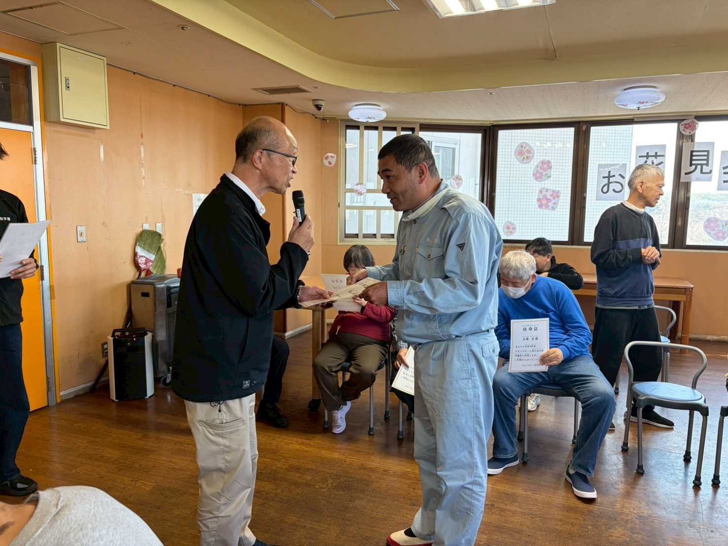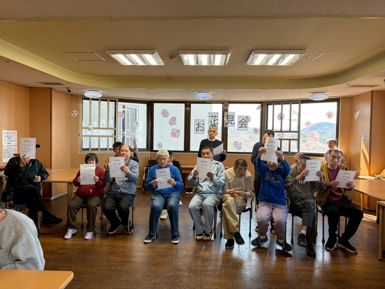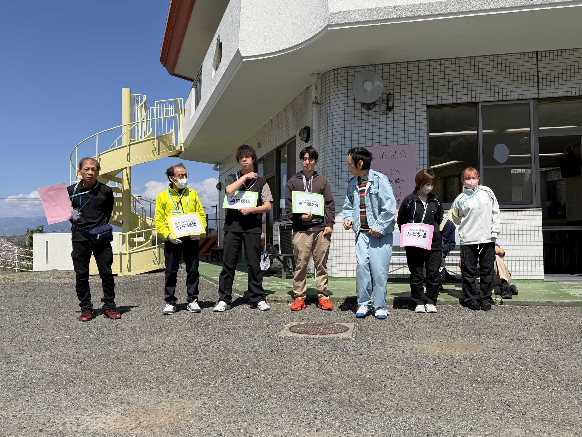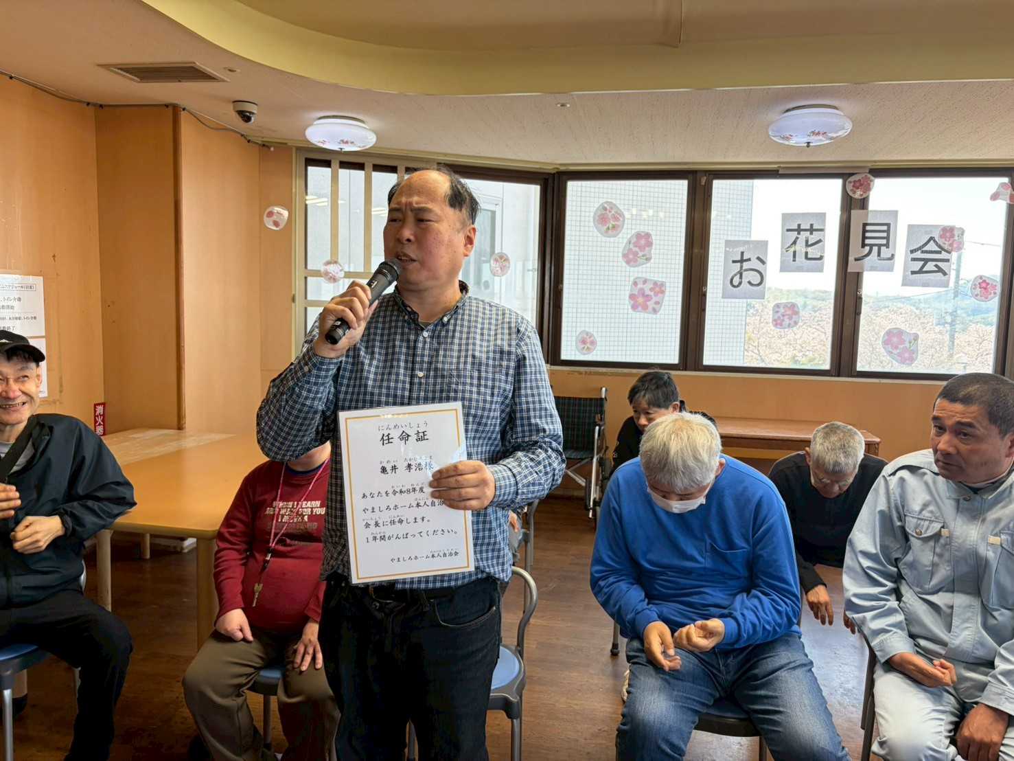 4月3日(金)うららかな青空と満開の桜の下でお花見会を開催しました。午前中は、お花見を楽しみながら、異動職員や新人職員への質問コーナーを実施し、和やかな雰囲気の中で交流を深めることができました。午後からは、やましろ本人自治会の任命式を行い、新しい体制のスタートをみんなで見届けました。